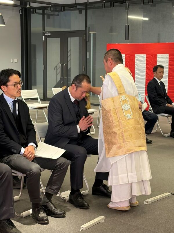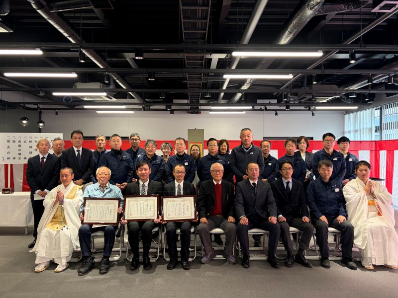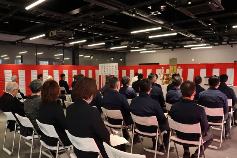 1月27日(火)9時半より、新事務所棟1Fにて竣工式が行われ、報恩寺の導師様をはじめ、設計・施工等関連会社など社内外関係者約30名程度が参加しました。無事にこの日を迎えることができ、協力いただいた方々に感謝いたします。また、同日のお昼休憩時間に従業員向けにお披露目見学会が行われました。